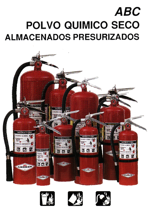 Los extintores ABC ó de Múltiple usos ; utilizan un polvo químico seco, especialmente fluídizado y silíconizado de mónofosfato de ammonia, Aísla químicamente los fuegos de Clase A fundiendose aproximadamente a unos 350 (grados) F y cubriendo toda la superficie donde se aplica; sofoca y rompe la reacción en cadena de los fuegos de Clase B y no conduce electricidad para el operador.