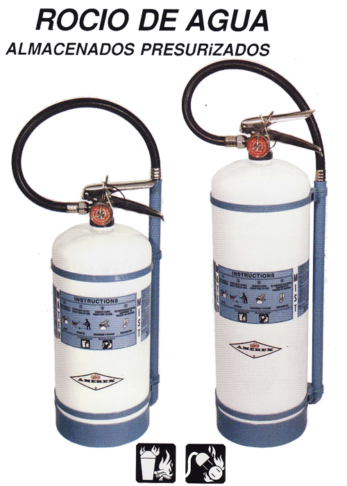 El extintor de ROCIO DE AGUA o WATER MIST es lo ultimo inventado para fuegos de Clase A especialmente donde existan riesgos potenciales de Clase C (eléctrico). La Neblina fina y su boquilla provee seguridad contra choque eléctrico , aunque la s características de enfriamento y mojado del agente y reduce la dispersion de los materiales incendarios.